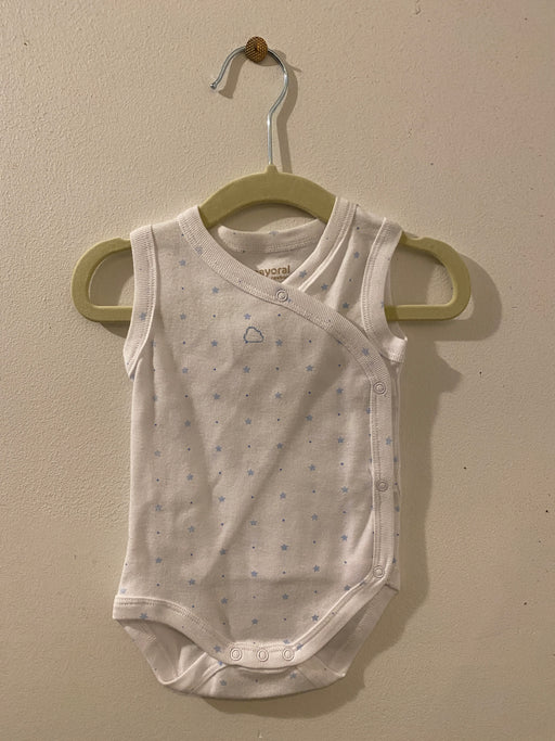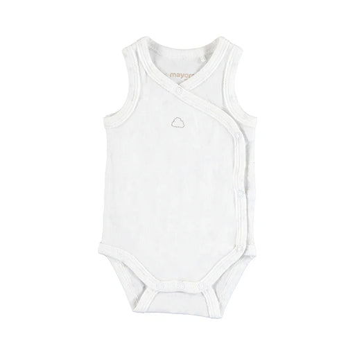 Mayoral sleeveless bodysuit for newborns, featuring a plain crossover neckline and a full side opening with snap button closures for easy dressing.