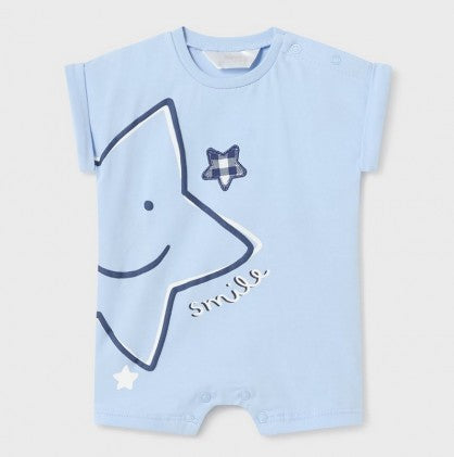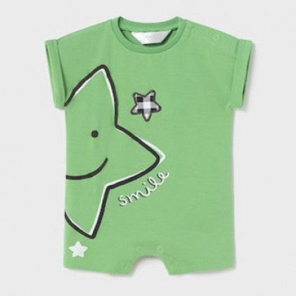 Mayoral cotton rompers.  One style is white with stars outlined in dark blue in yellow, blue, or green.  The other style in a solid color has a lar...