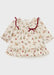 Beige dress for baby girls by Mayoral. Made from soft cotton with deer, foxes, mushroom and Hedgehog print pattern, it has pintuck pleats on the bodice with red velvet ruffles and bow. Lined in soft cotton for comfort and fastens with buttons at the back.