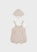Mayoral brown and white overall romper with hat. Rompers with suspenders in brown with overall pattern of white stars. Attached shirt is white with brown piping around the collar and short sleeves. Hat is brown with white stars to match romper. Cotton. 1616.