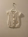 Mayoral newborn ecofriends romper, white with gold stripes, short sleeves with ruffle. Bird with crown appliqué on front.