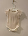 Mayoral newborn onesie, white with pink stripes. Sleeveless with ruffles around arms, buttons on shoulders.